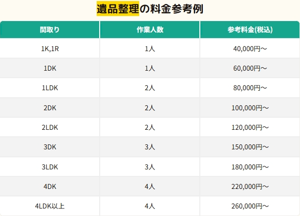 - 特殊作業: ゴミ屋敷状態の清掃や仏壇や位牌の供養などは、別途費用が発生します。