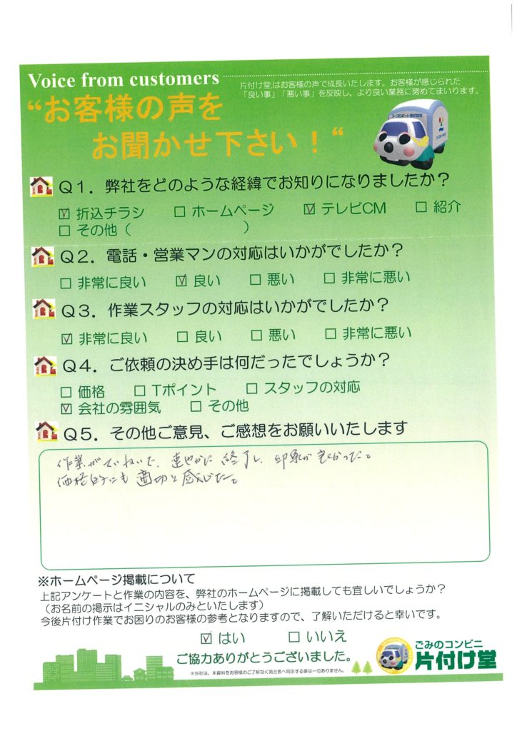 松江市N様 お客様のお声を頂戴しました! 片付け堂 松江店(不用品、粗大ごみ回…