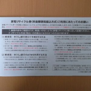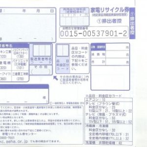 メーカー番号や商品番号を調べ、郵便局等においてあるリサイクル券に必要事項を記入し、手数料を払い、リサイクル券を品物に貼って家電リサイクル受付センターへ持ち込む。という流れになっております。