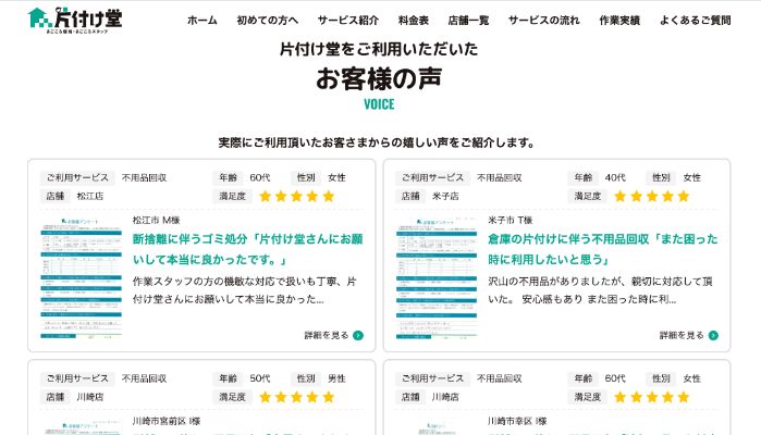 片付け堂では、実際にご利用いただいたお客様にアンケートを実施し、今後のサービスの向上に役立てています。全国のお客様の声から、利用したサービス内容や店舗、お客様の属性ごとに絞り込みもできます。おかげさまで、たくさんのお客様に高評価をいただいております。ぜひ覗いてみてください!